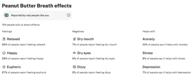 Peanut Butter Breath, also known as “Peanut Butter” and “Peanut Breath,” is a hybrid marijuana strain known for its sedating effects. Crossed with Do-Si-Dos and Mendo Breath, Peanut Butter Breath has a unique nutty and earthy terpene profile when smoked. Beyond the terps, this strain will bring you down into a quality state of chill and relaxation. Originally from ThugPug Genetics, Peanut Butter Breath is very popular and there are many Do-Si-Dos and Mendo Breath crosses out there—breeders Clout King have one called “Peanut Butter Cup.”