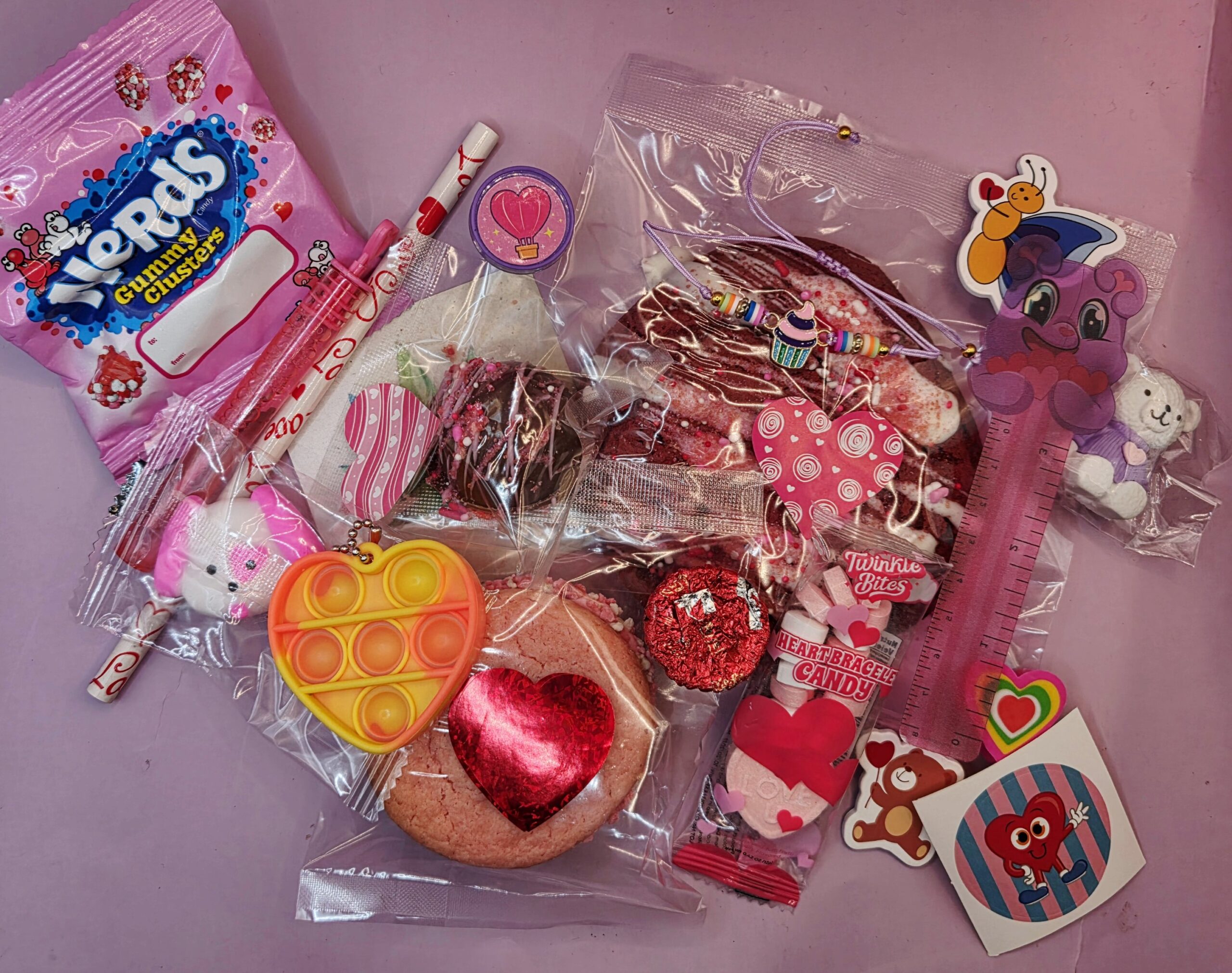 a variety of unmedicated home made cookies and caramel chocolate and candy and toys